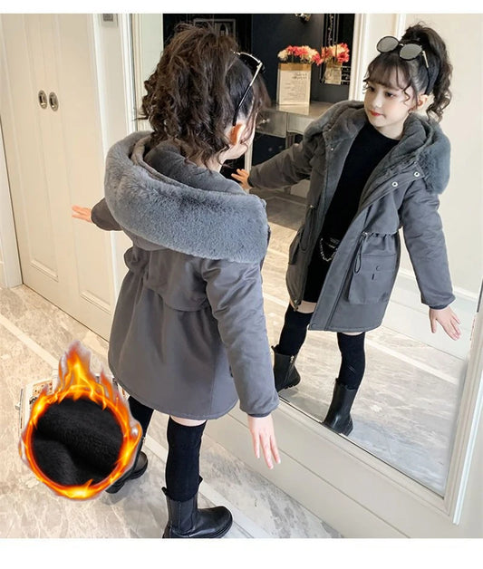 -30° Girls Cotton Coats Winter Plus Velvet Jackets Kids Hooded Outerwear Solid Colour Casual Overcoat Warm Thicken Parkas