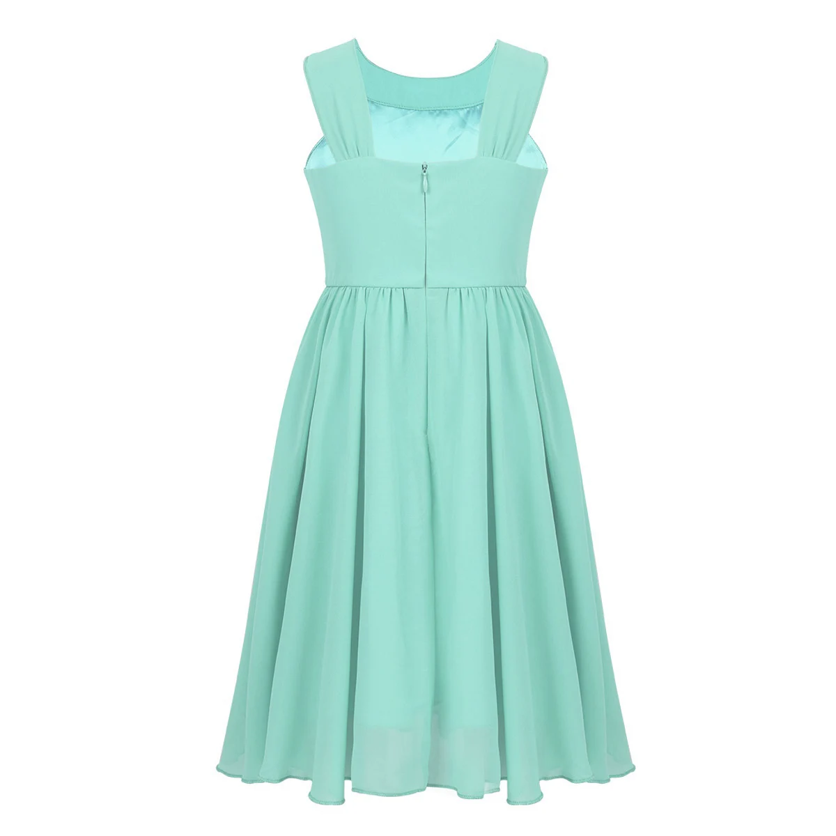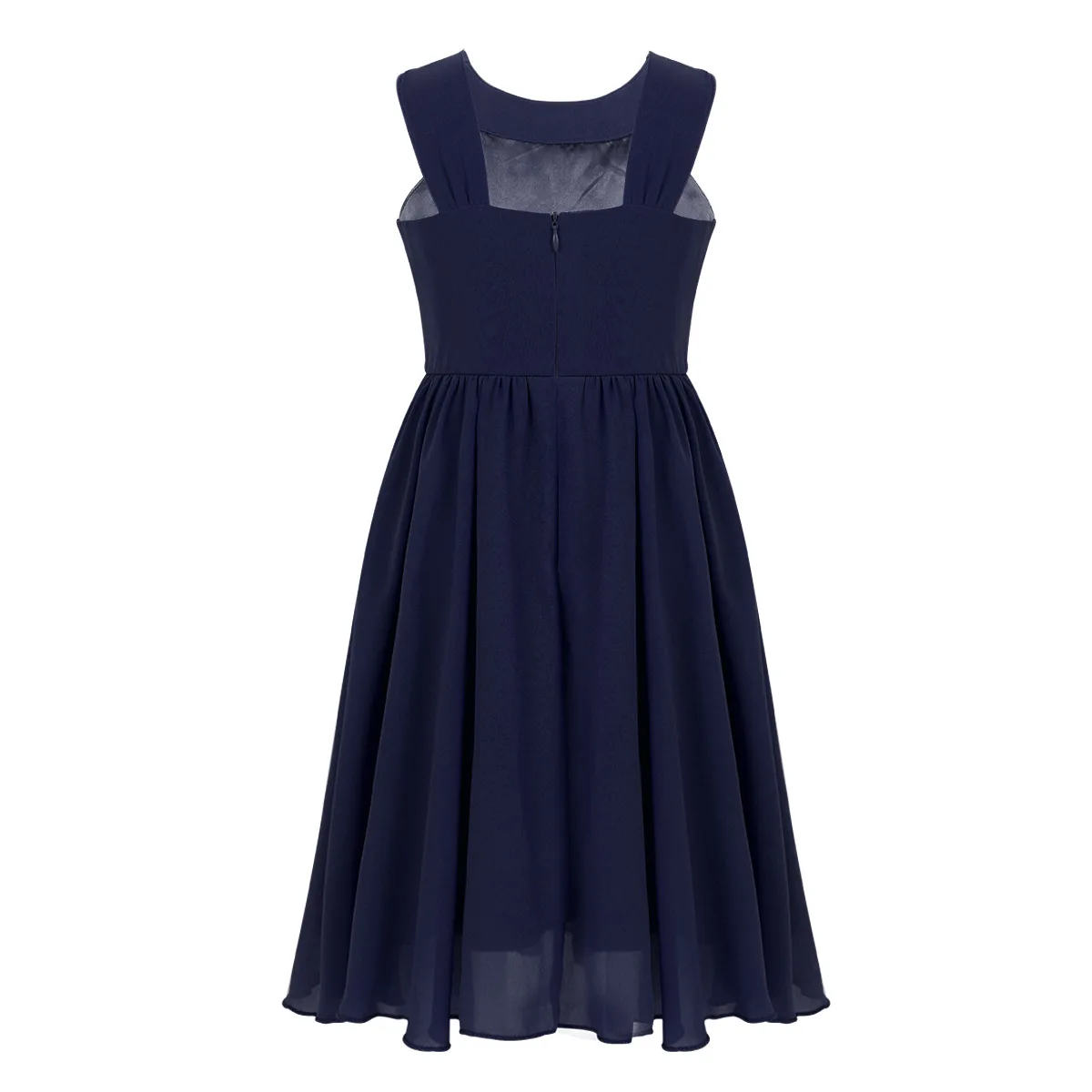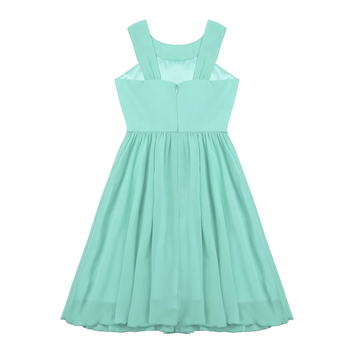 Hidden center back zipper closure. 2 layers dress, top chiffon layer, 1 lining. Beautiful and stylish dress for your girl.