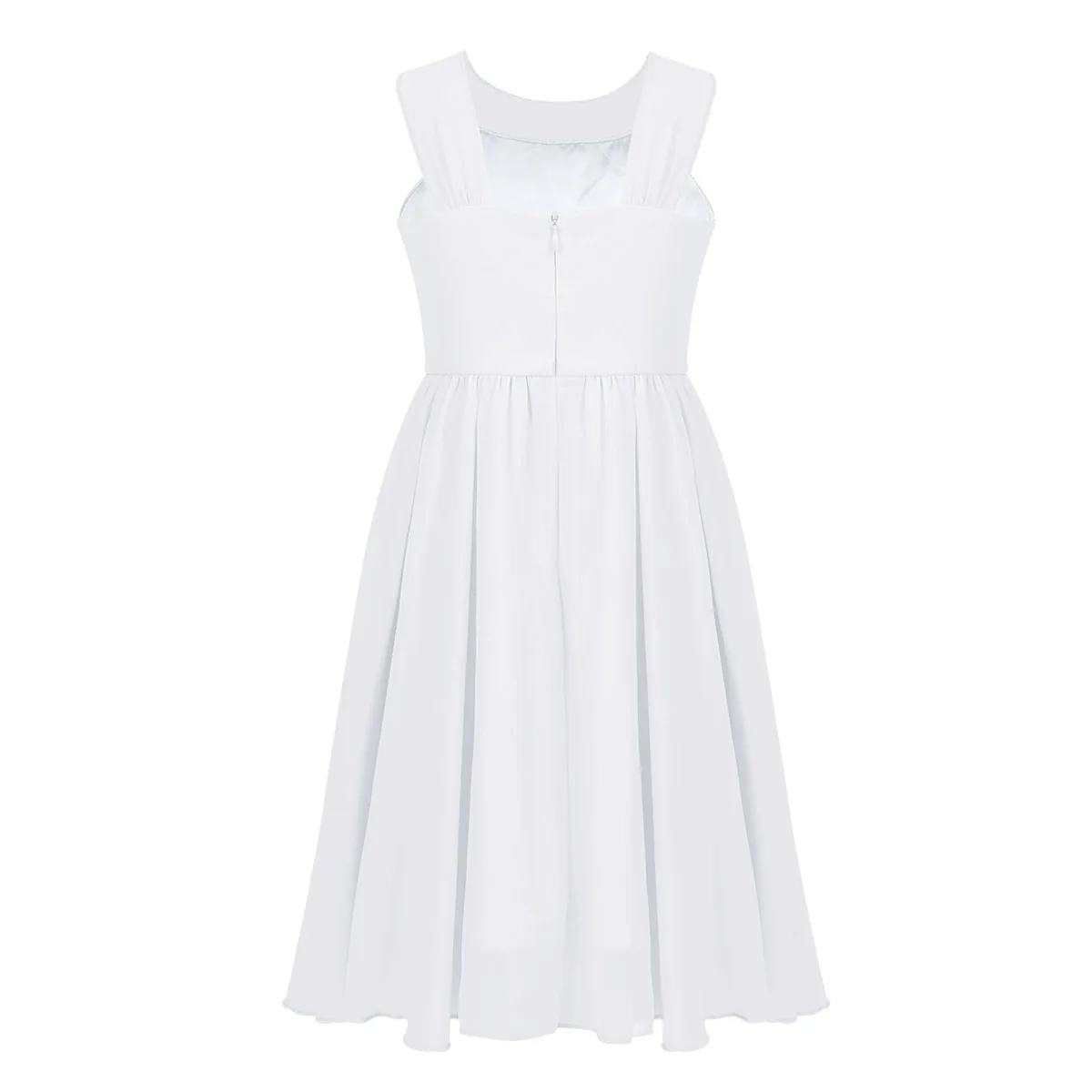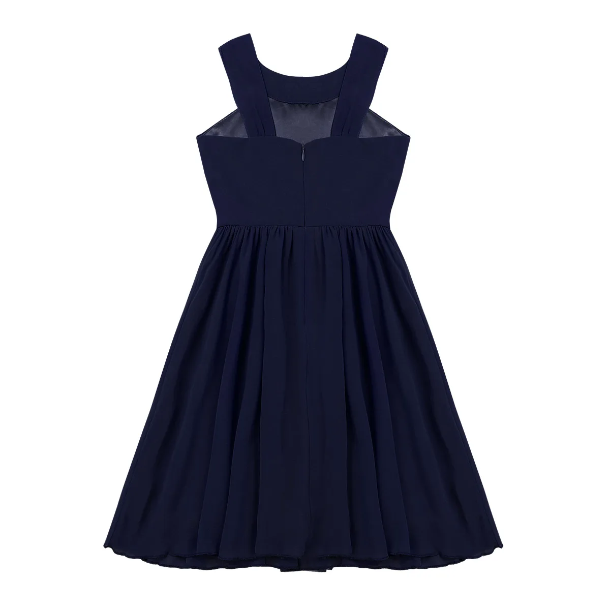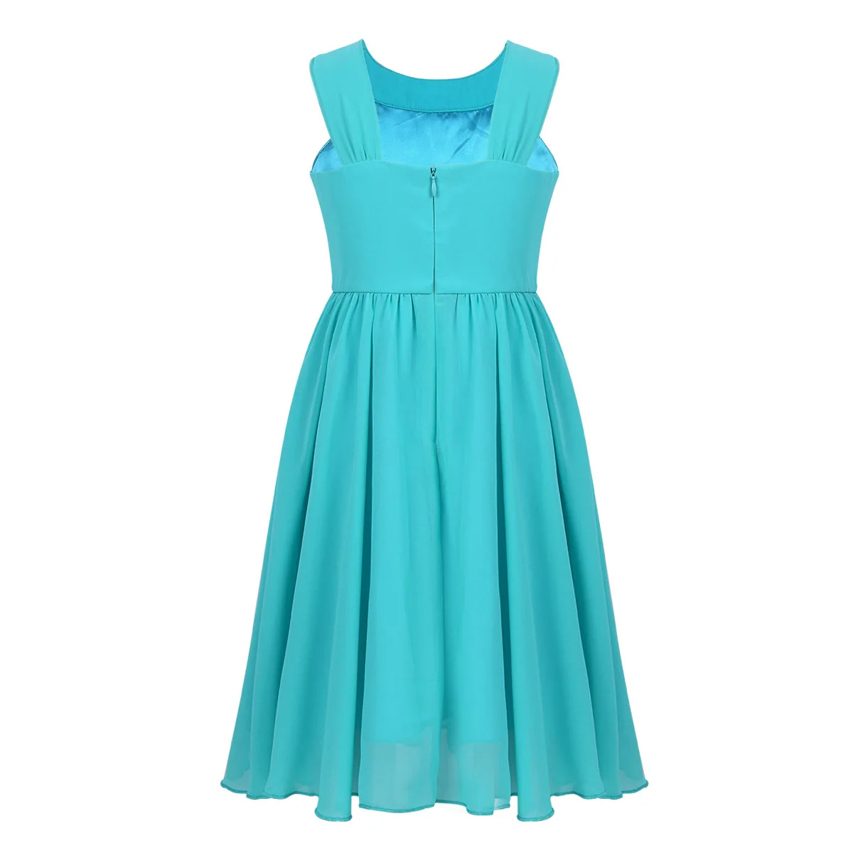 Hidden center back zipper closure. 2 layers dress, top chiffon layer, 1 lining. Beautiful and stylish dress for your girl.