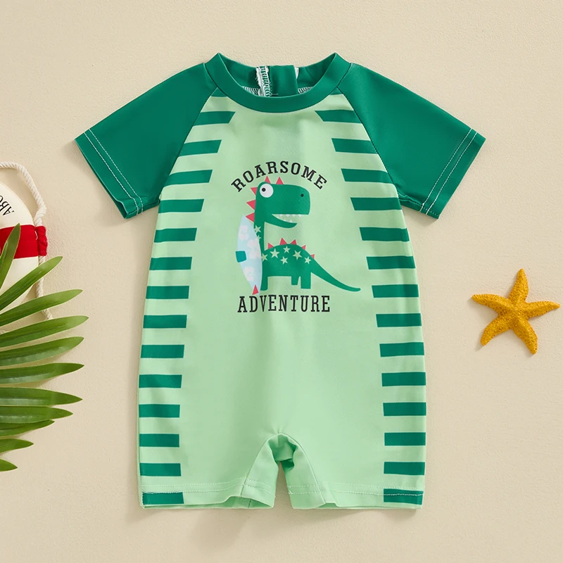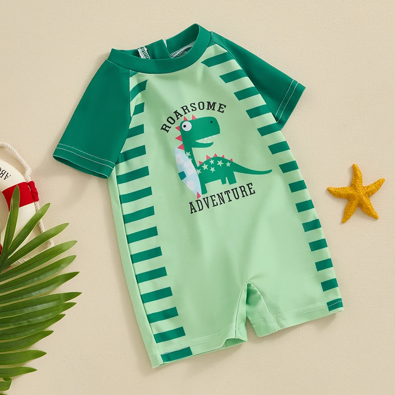 Baby boy swimwear, monokini swimsuit, cartoon dinosaur print, add fashion. Round neck, short sleeves, easy to put on and take off, perfect for summer.