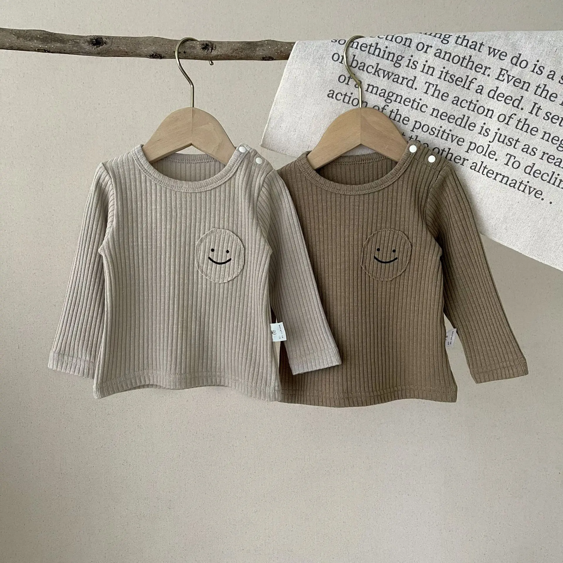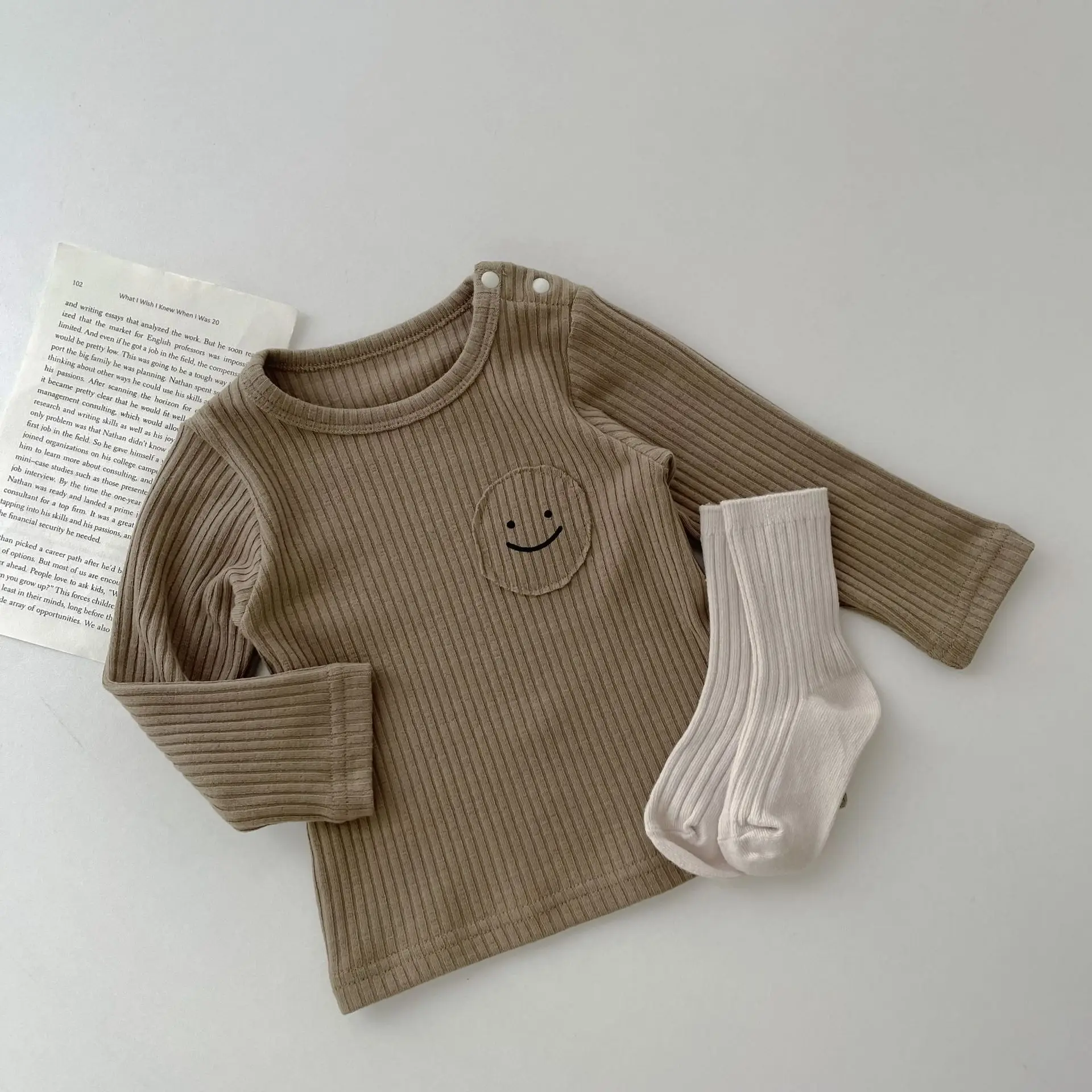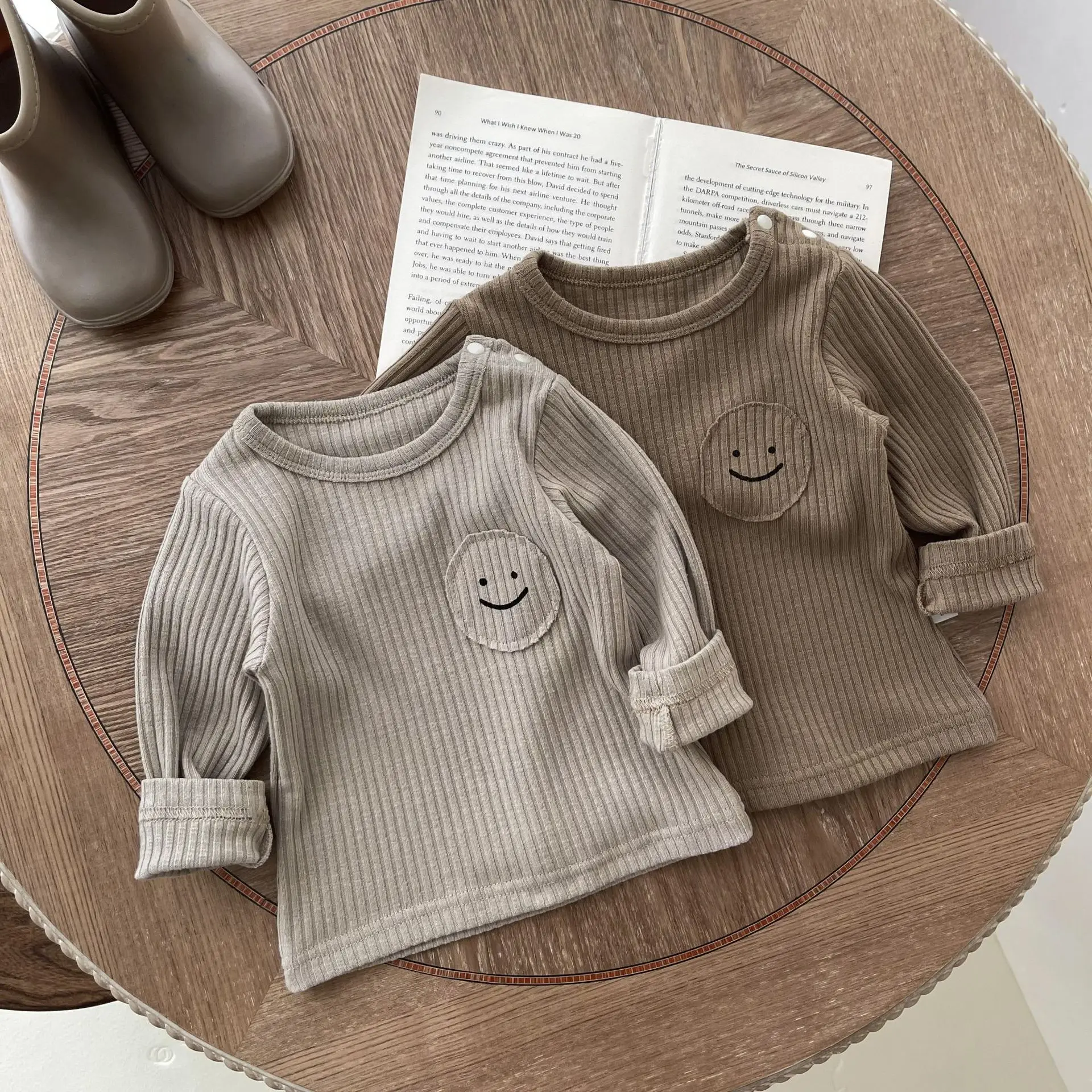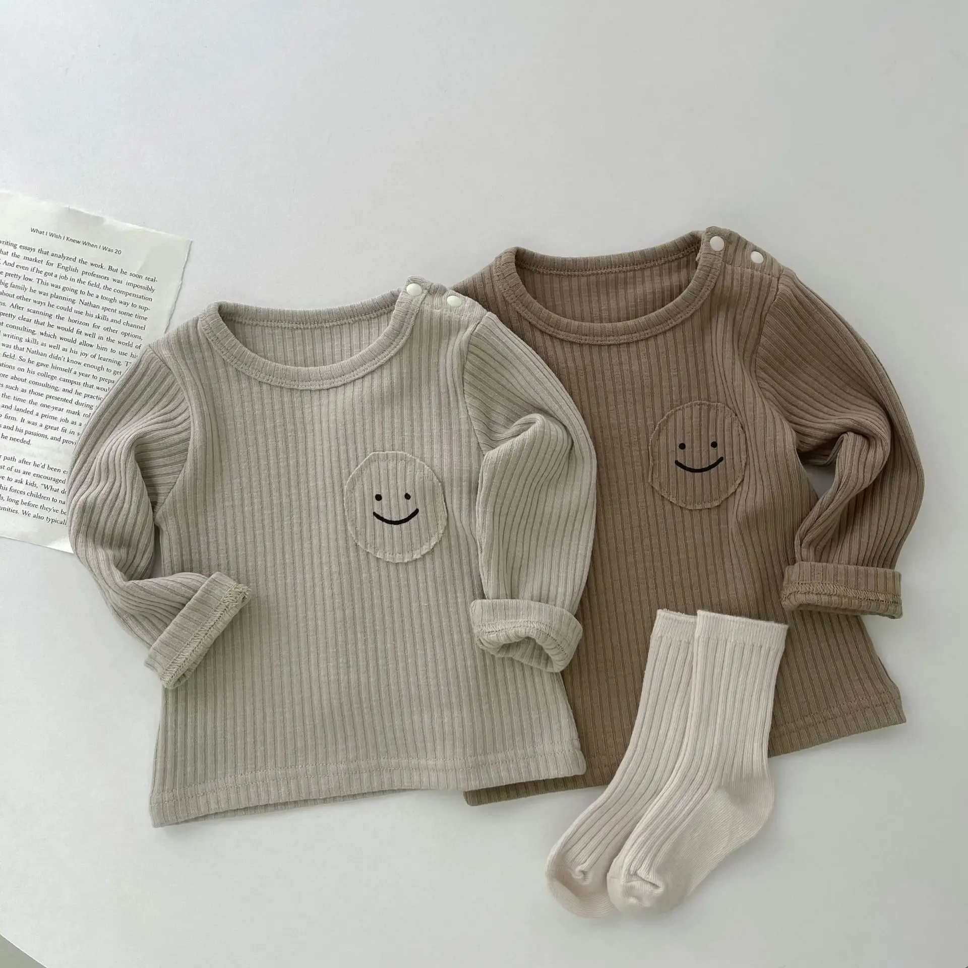 Nuevas camisetas de manga larga para bebé, camisetas de algodón para recién nacidos con parche de cara sonriente, camisa de bajo de punto acanalada, camisetas para niños y niñas de 0 a 24M