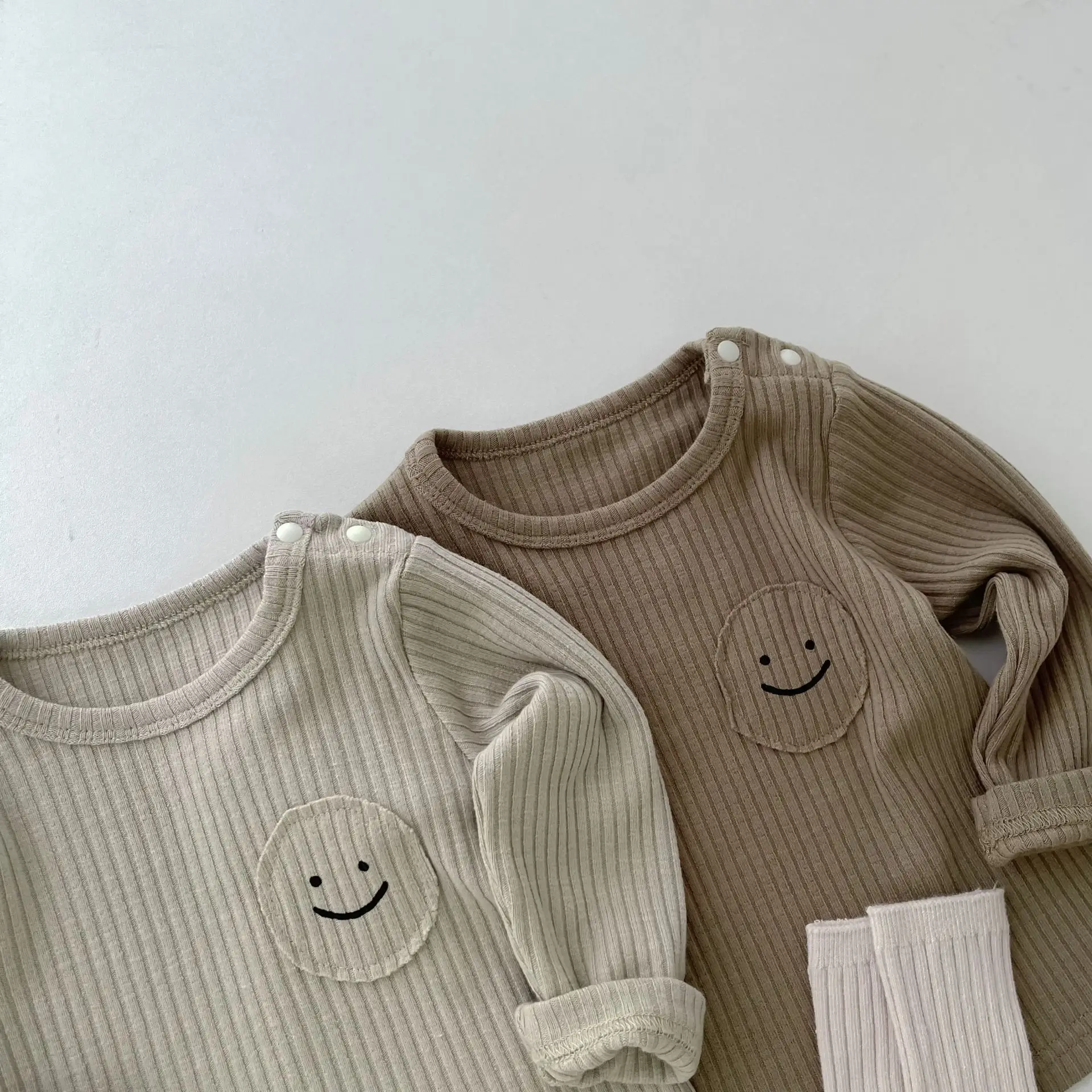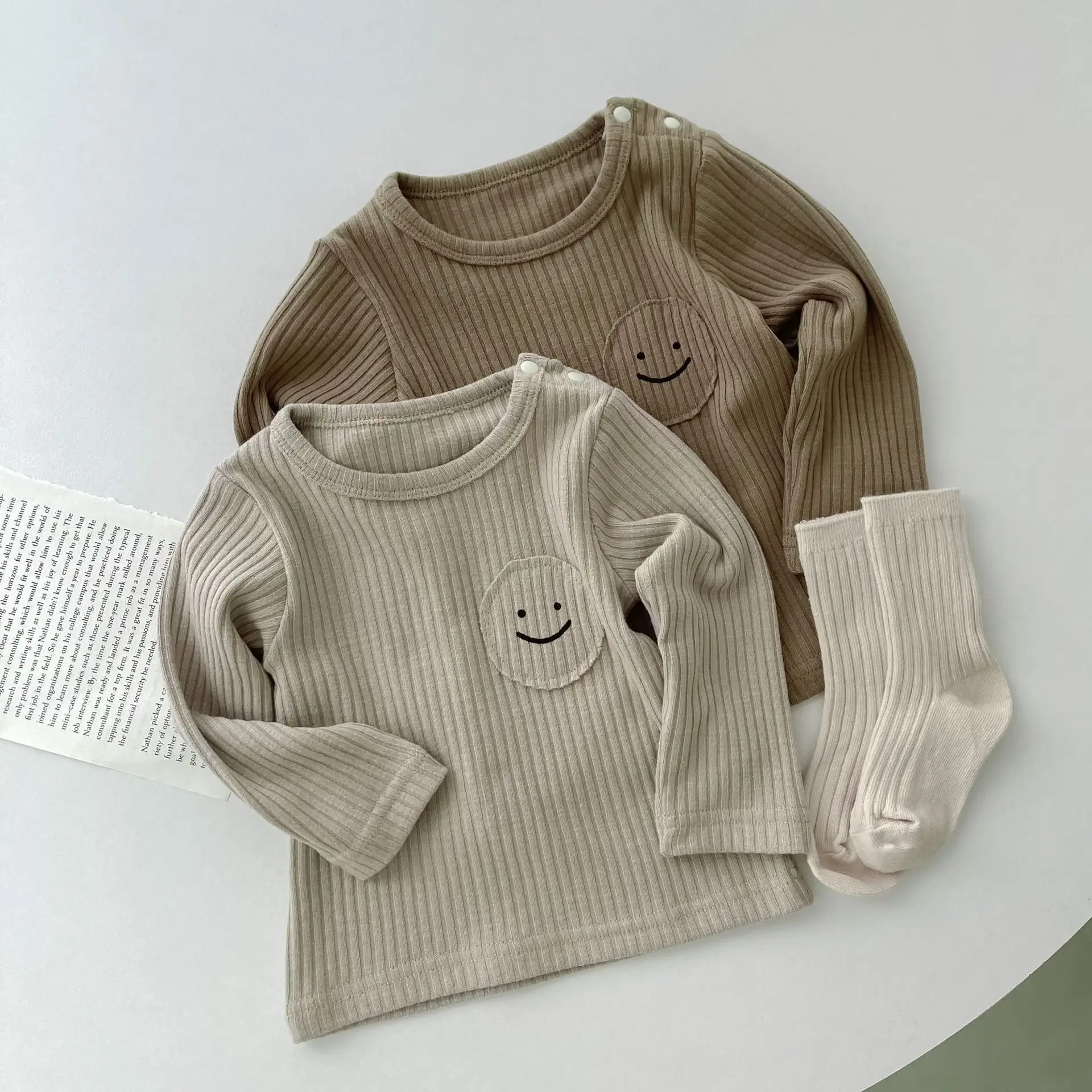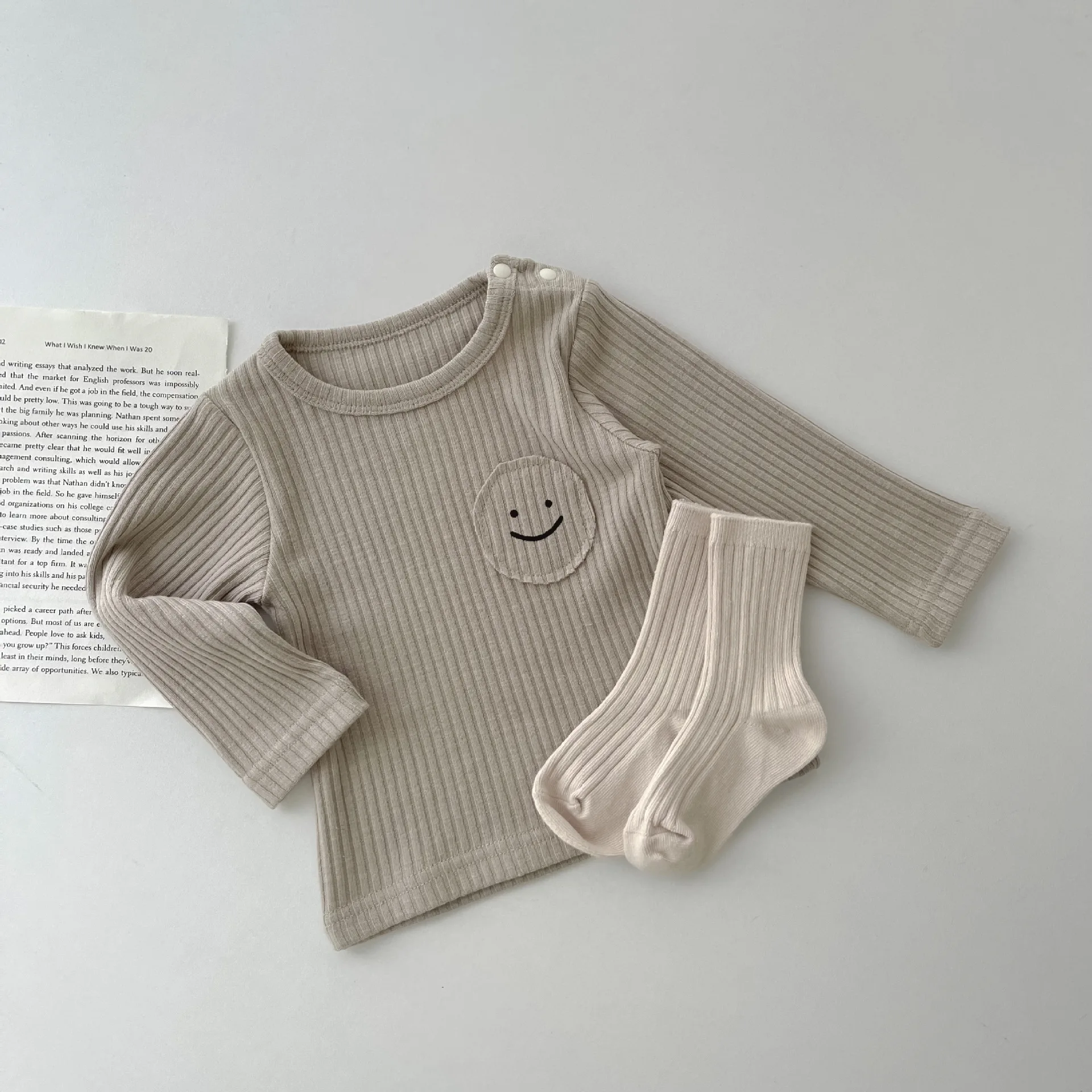 Nuevas camisetas de manga larga para bebé, camisetas de algodón para recién nacidos con parche de cara sonriente, camisa de bajo de punto acanalada, camisetas para niños y niñas de 0 a 24M