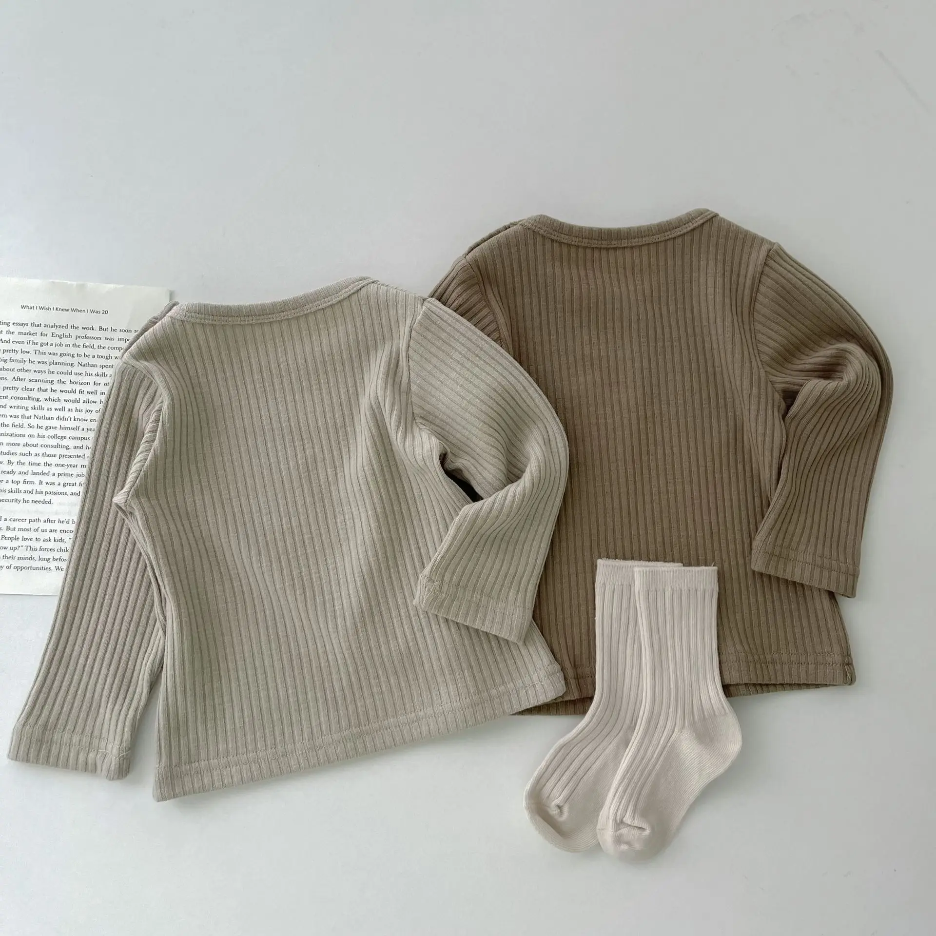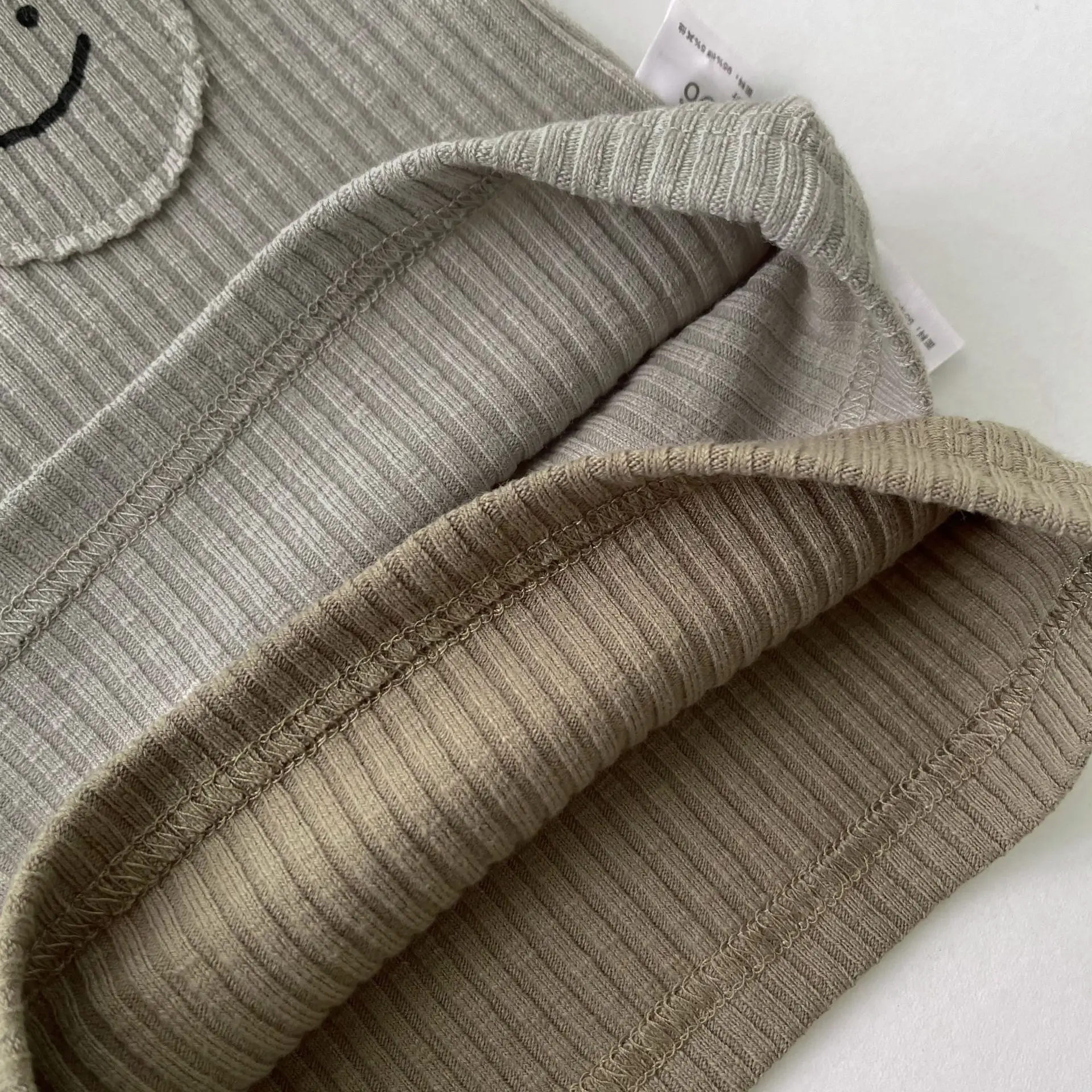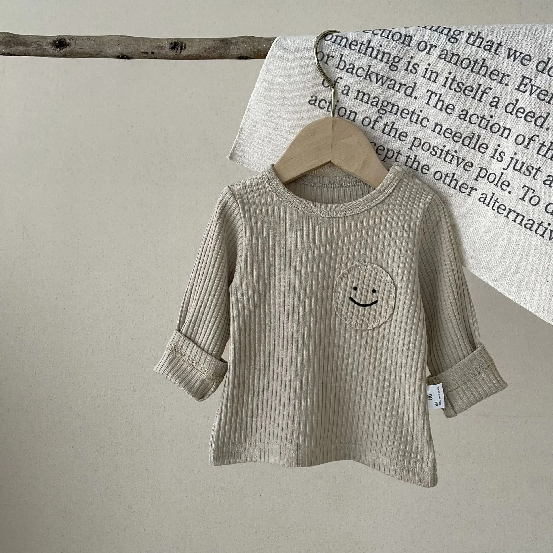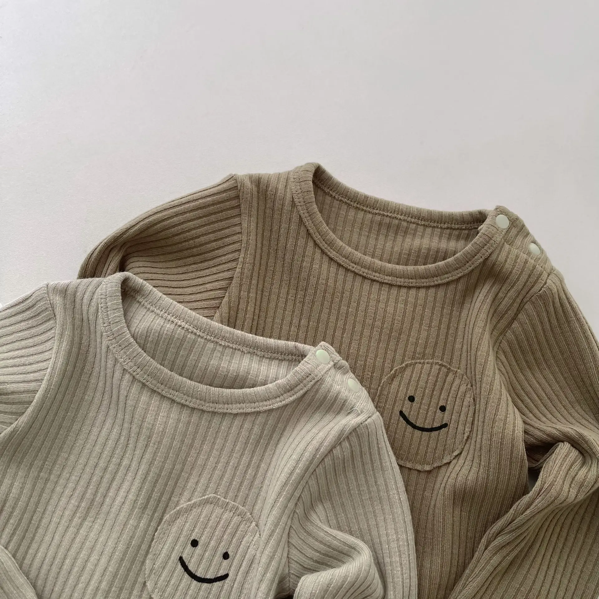 Nuevas camisetas de manga larga para bebé, camisetas de algodón para recién nacidos con parche de cara sonriente, camisa de bajo de punto acanalada, camisetas para niños y niñas de 0 a 24M