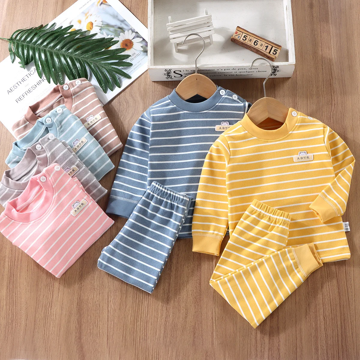 Conjuntos de pijamas para niños y niñas, camiseta de manga larga a rayas con cuello redondo y pantalones, ropa de dormir cálida de otoño para niños pequeños