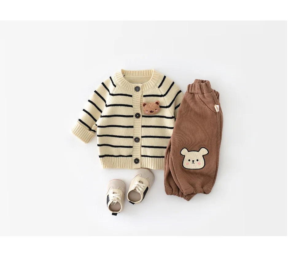 Otoño nuevo cárdigan de manga larga para bebés y niños, abrigo de punto para niños, chaqueta para niños pequeños, suéter para recién nacidos, Tops bonitos con estampado de oso a rayas
