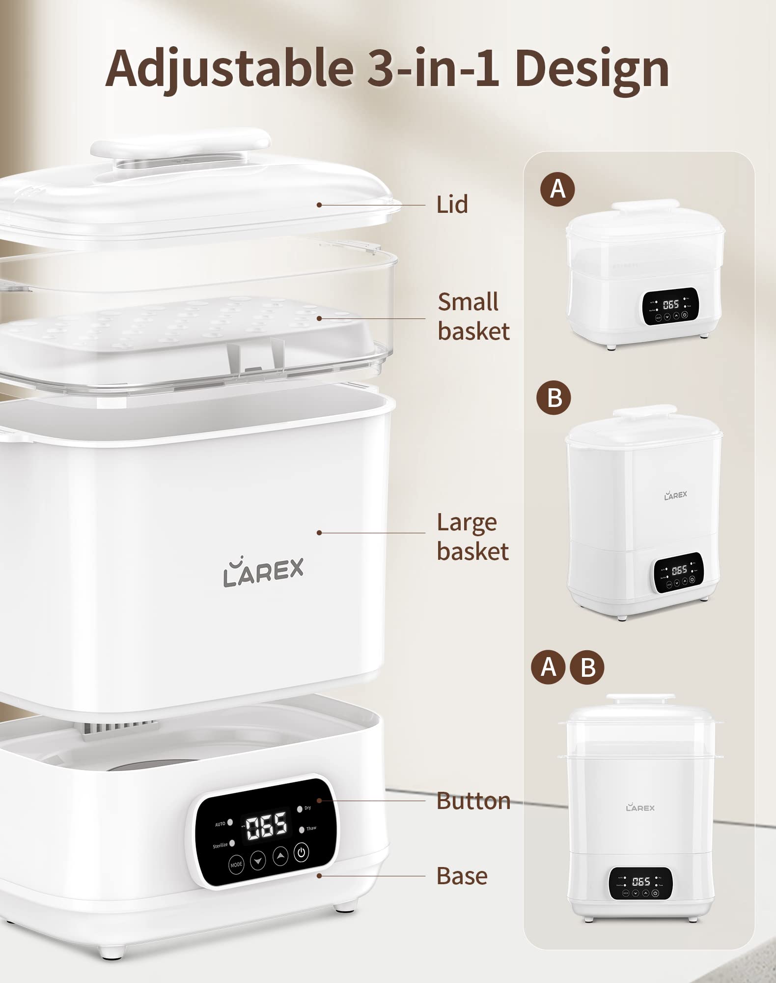 - 🍼DISEÑO 4 EN 1: Con este esterilizador de biberones, puede esterilizar solo con vapor, solo secar, esterilizar y secar, e incluso cocinar al vapor alimentos para bebés.