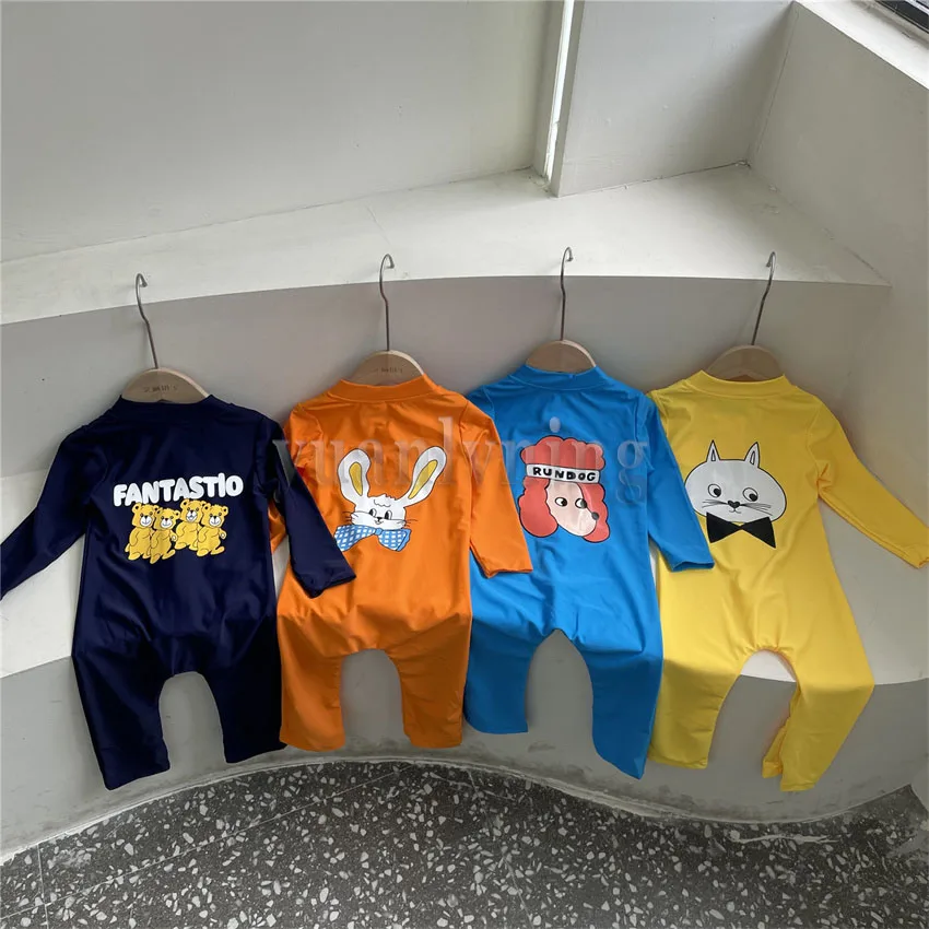 Traje de baño de verano para bebé, traje de baño de una pieza de manga larga con dibujos animados para niño y niña, traje de baño con cremallera, mono de playa con protección solar para niño