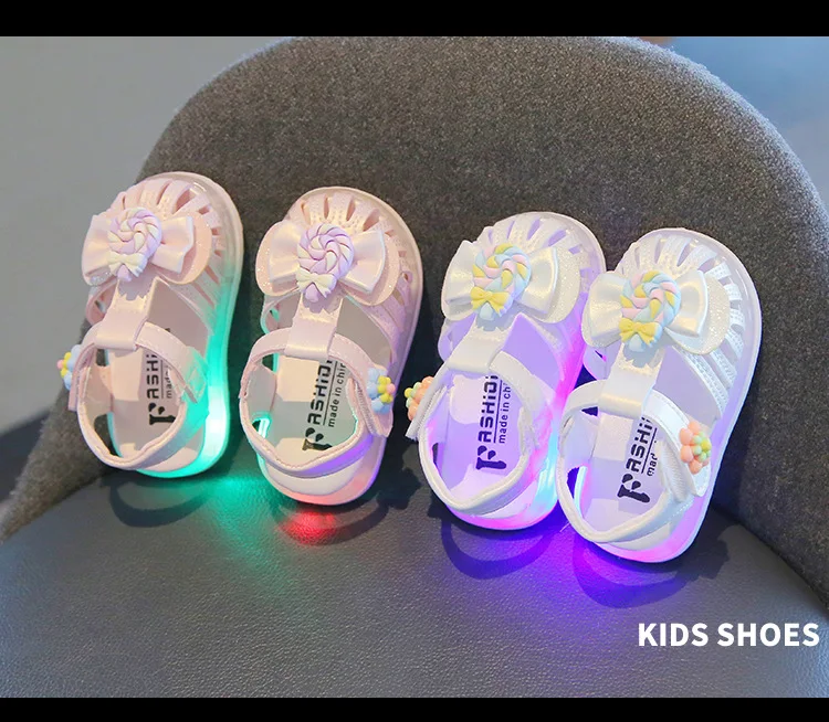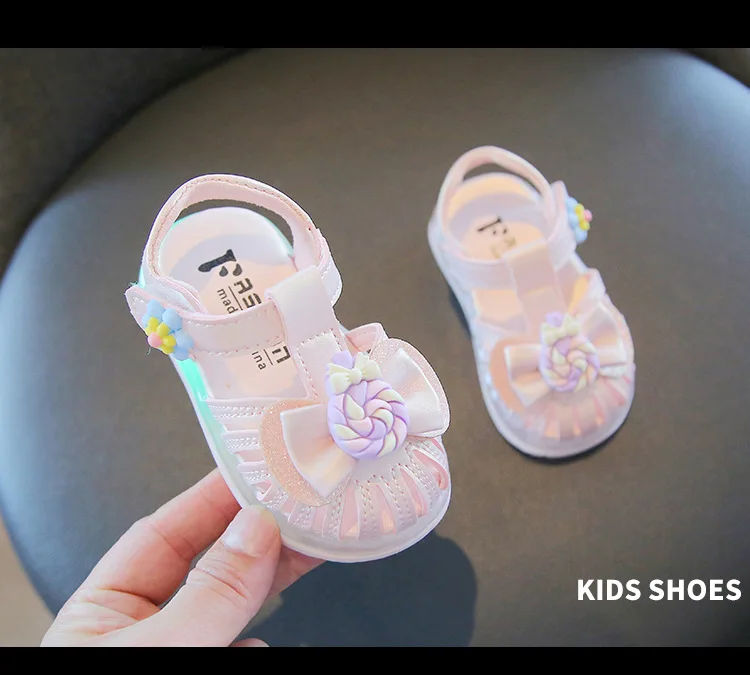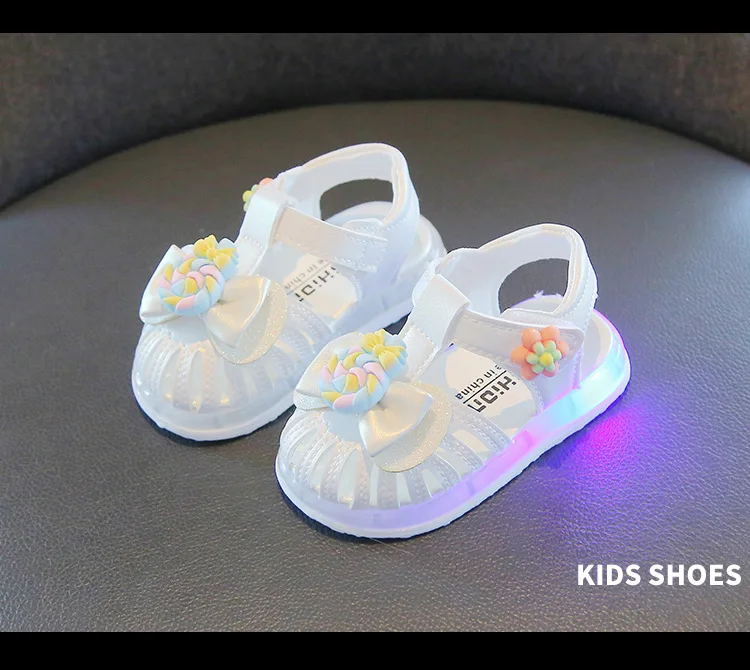 Sandalias con luz LED de verano para niña, zapatos de suela suave con flor de caramelo, sandalias de princesa brillantes con agujeros para niño