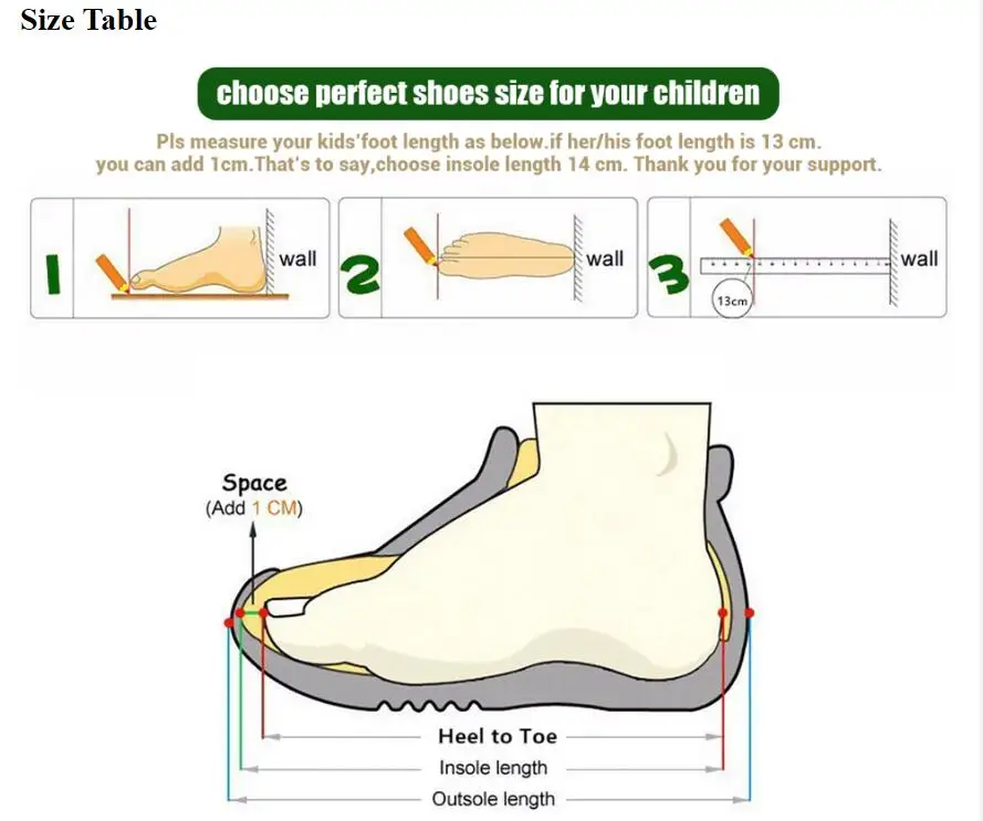 There may be a 5mm difference between the length of the shoe and the inner length. Pls read the size chart carefully or choose a larger size before buying. We recommend that customers choosefoot length+1cm=Insole length.