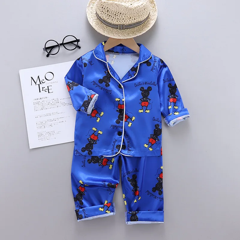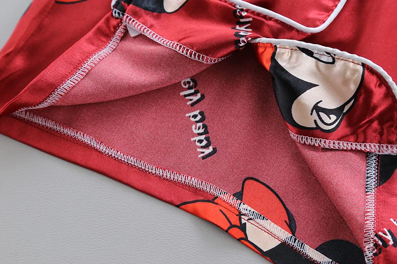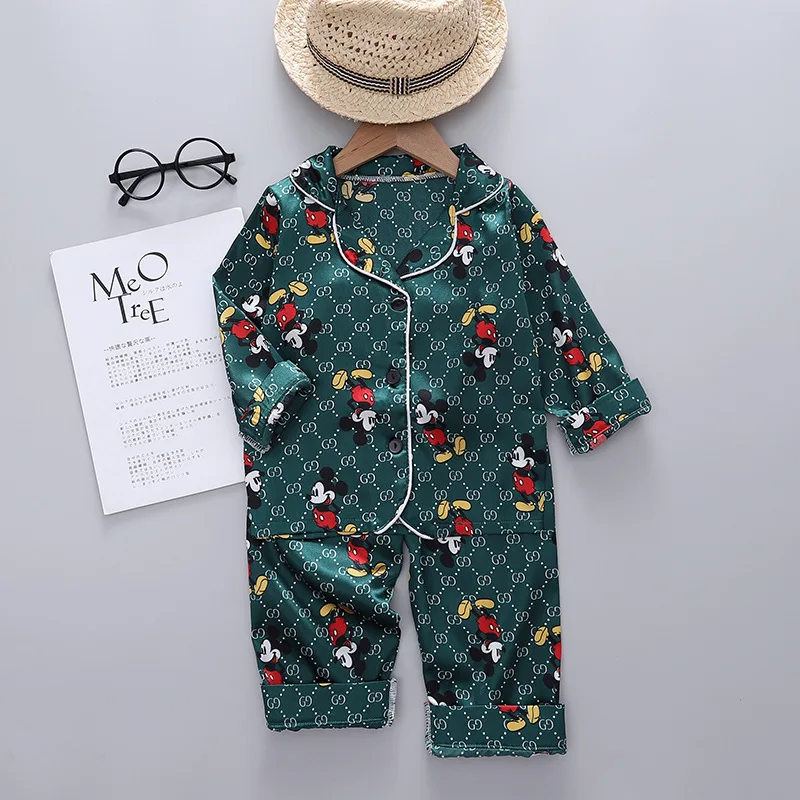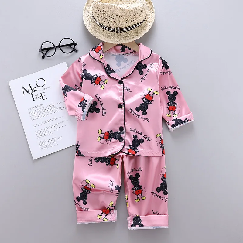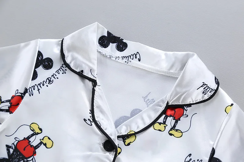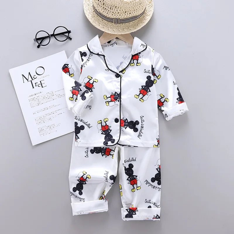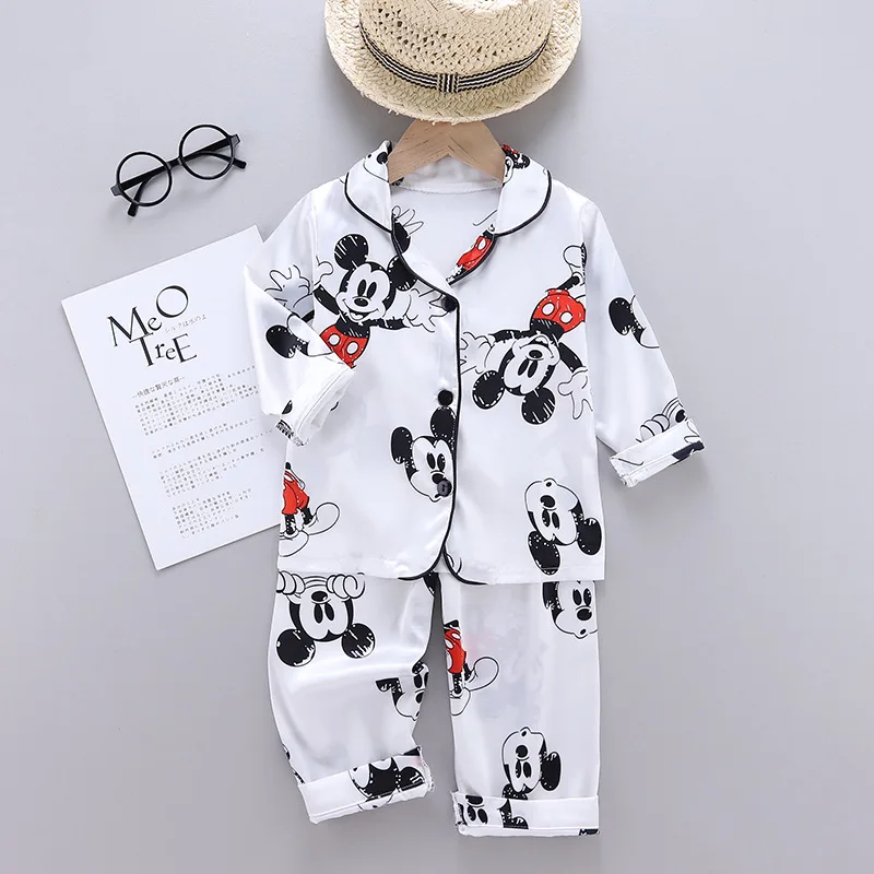 Disney Mickey Mouse Children Pajamas Suit Silk Satin Long Sleeve Top+Trousers 2Pcs Baby Boys Girls Cartoon Satin Set Nightgown