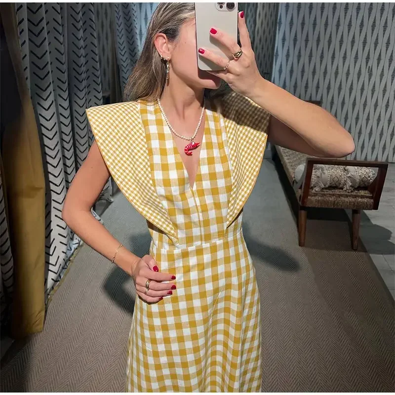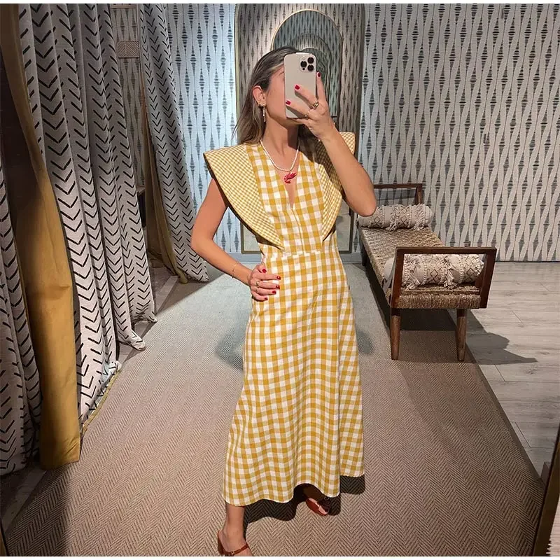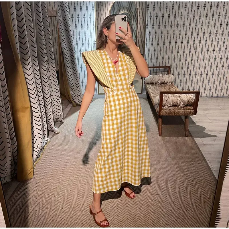 Women V Neck Plaid Print Maxi Dress Fashion Fly Sleeve High Waist Big Hem Slim Long Dresses Summer New Lady Holiday Vestidos